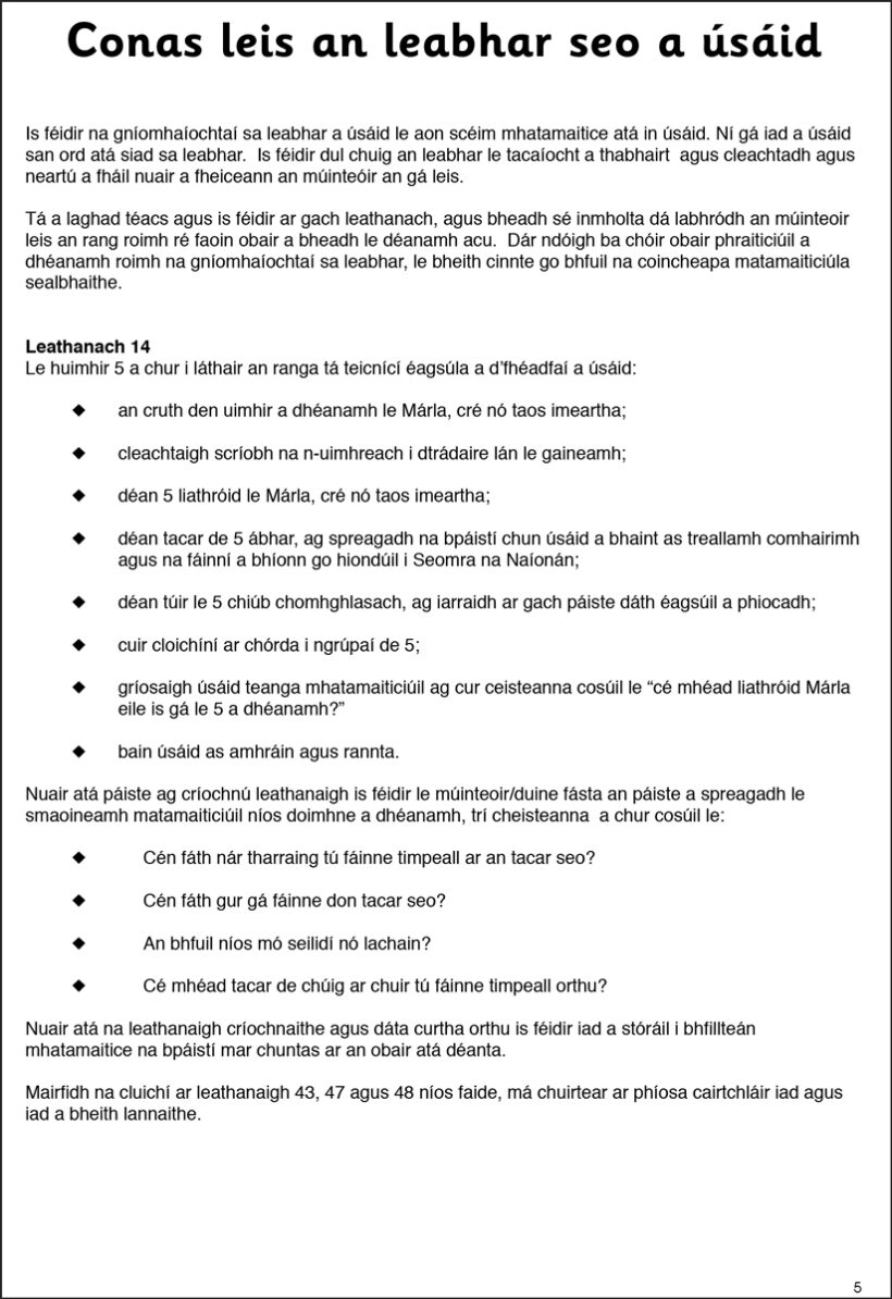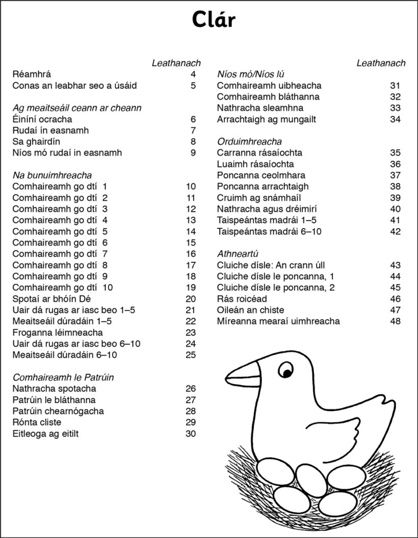 Tá saibhreas gníomhaíochtaí agus cluichí i Bí chun tosaigh ag Comhaireamh go dtí 10 a chuirfidh ar chumas an pháiste tuiscint a fhorbairt ar uimhreacha suas go 10. Clúdaíonn na leathanaigh oibre meaitseáil ceann ar cheann, bunuimhreacha, orduimhreacha, patrúin i gcomhaireamh agus níos mó/níos lú ná.