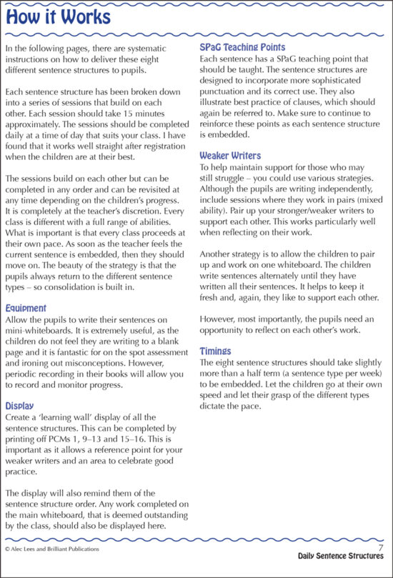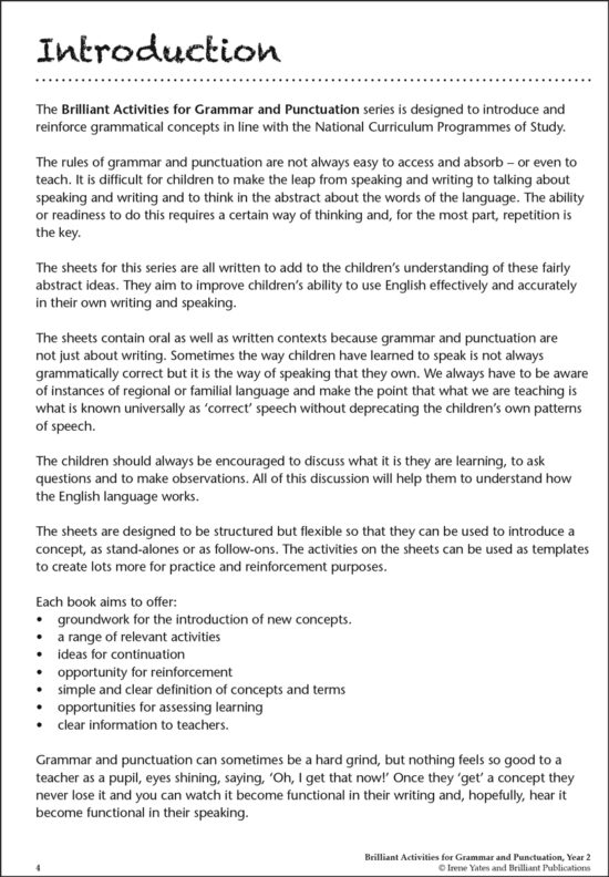 The books provide teachers with the tools they need to teach grammar effectively and will complement other language and literacy schemes of work. The activities teach the technical terms pupils need in order to be able to discuss language and promote the necessity of making the children’s learning functional. When pupils properly understand the effects that grammar and punctuation have on text, they can transfer that knowledge to their own writing and thus develop their skills.