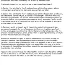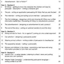 In Sections 3 and 4, for Years 5 and 6, the activities look at real issues and raise persuasive language in the form of debates and differences of opinion, specifically looking at lists, posters, articles, two-sided written arguments, letters and poetry. The chapters include lesson plans, a text, and a written or speaking and listening activity to promote the use of persuasive language.