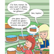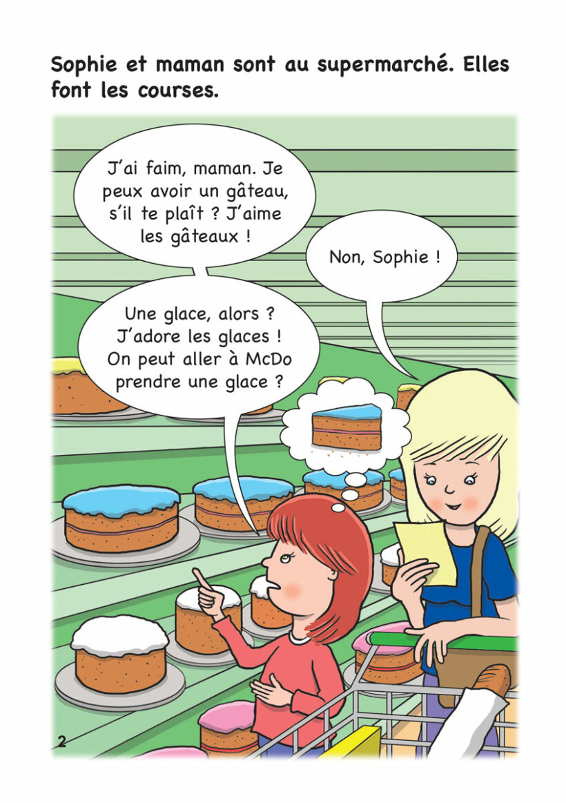 Sophie is going shopping with maman. Sophie is hungry and she tries to get maman to buy her some cake or some ice cream. What will maman do?