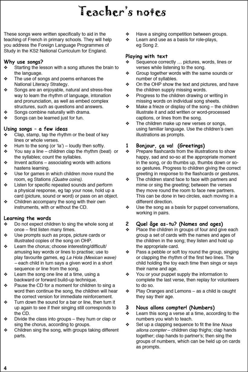 The 16 specially composed songs and 4 traditional songs are sung by native French children on the CD, so you don’t need to worry about your own singing ability. They include lots of repetition, simple musical phrases and lots of opportunity for adaptation. You will find that pupils will want to join in – not just with singing, but also clapping, beating rhythms, dancing and making gestures. Once pupils are familiar with the songs, the instrumental tracks will allow them create their own versions.