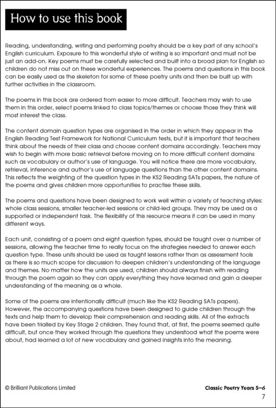 Each of the 12 extracts from contemporary children’s literature is accompanied by eight sets of questions based on the Key Stage 2 (KS2) Reading Content Domains and National Curriculum. This book provides opportunities to tackle more complex vocabulary, explore how authors use language to impact their readers and develop endurance for longer passages.