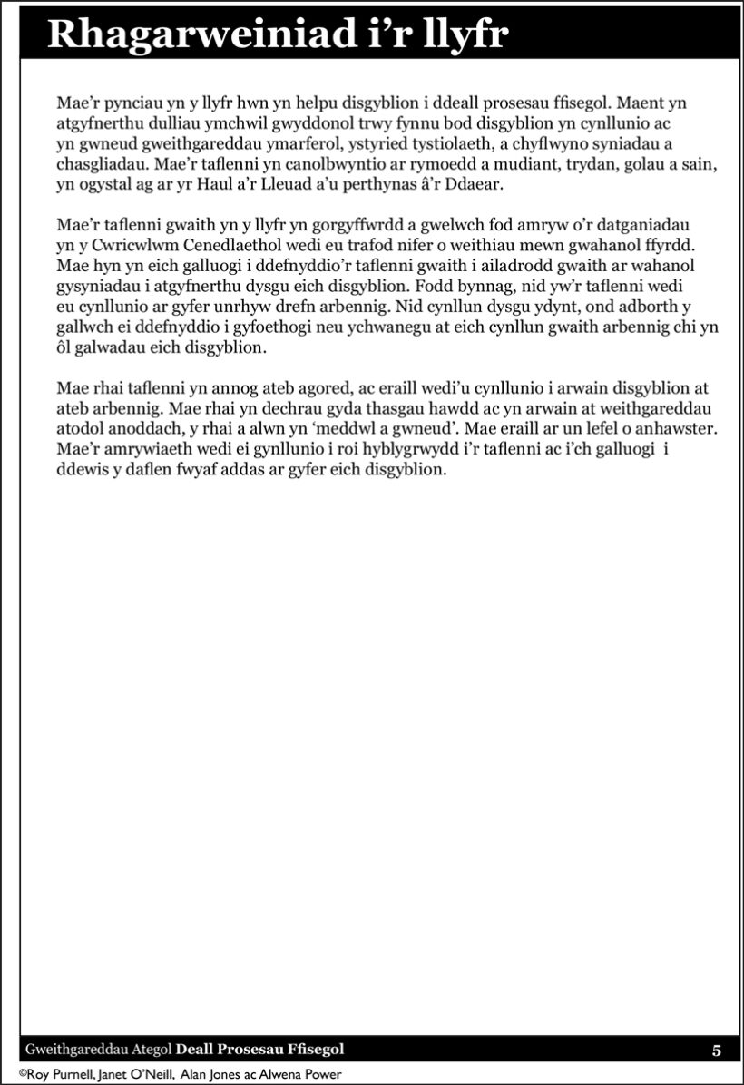 The topics in Deall Prosesau Ffisegol help pupils understand physical processes. They reinforce methods of scientific enquiry by requiring pupils to plan and carry out practical activities, consider evidence, and present ideas and conclusions. The sheets focus on forces and motion, electricity, light and sound, as well as on the Sun and Moon and their relationship to the Earth.