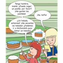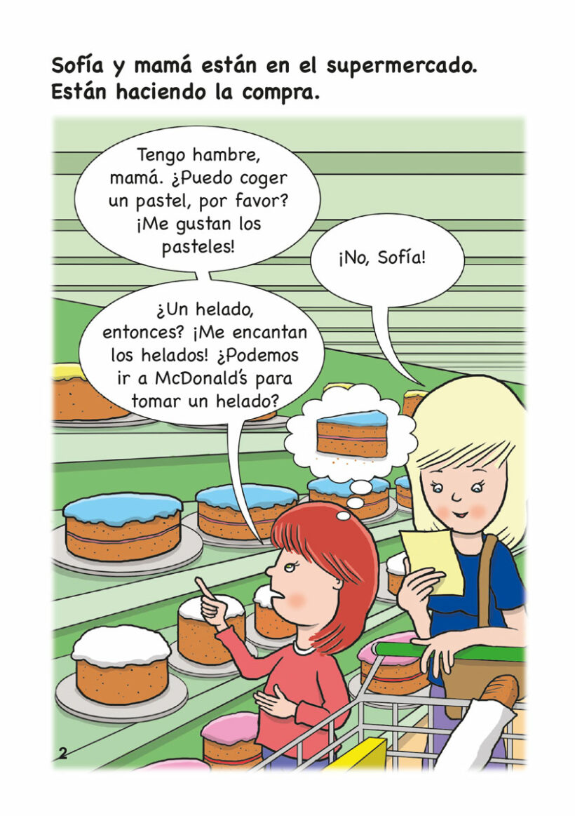 Sofía is going shopping with mamá. Sofía is hungry and she tries to get mamá to buy her some cake or some ice cream. What will mamá do?