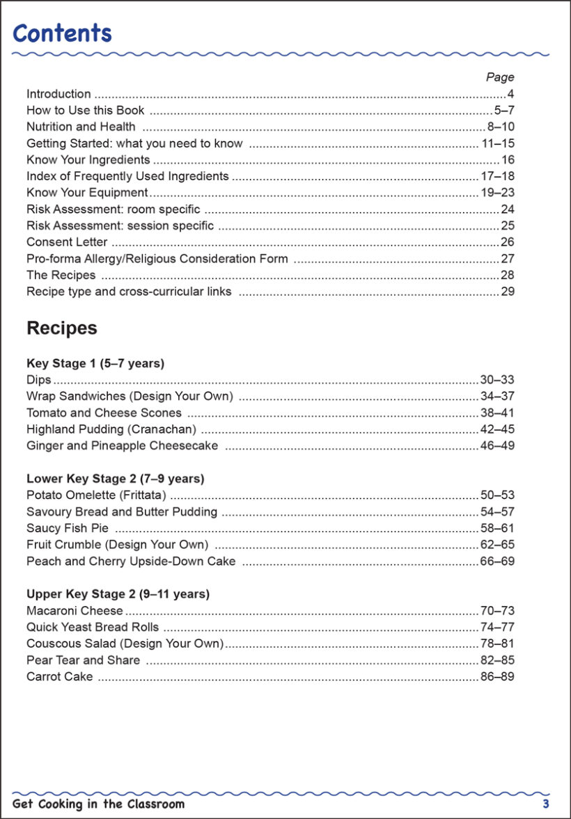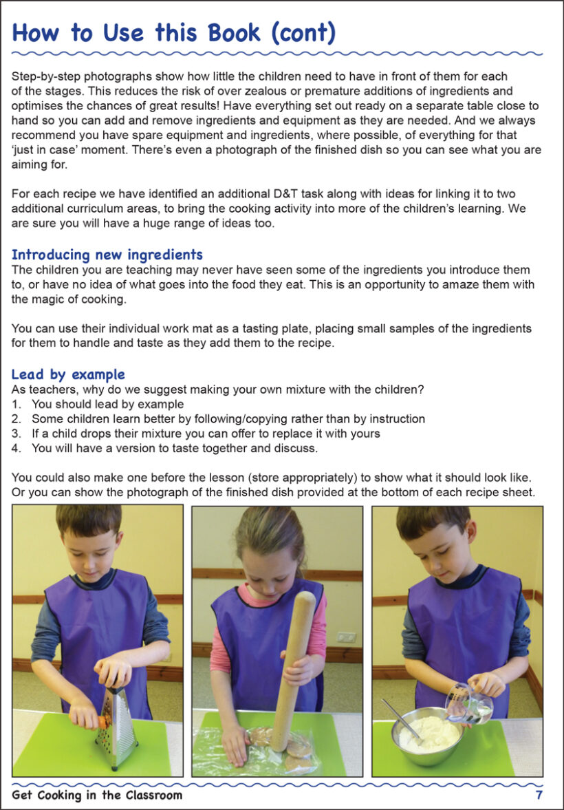 Each of the 15 recipes in Get Cooking in the Primary Classroom is made as an individual mixture so children make and see their own achievements. The results are designed to go home with the child to share and demonstrate their new skills to siblings, parents, relations and friends. This can provide an excellent opportunity for celebrating achievement and lead to discussion about new foods and flavours at home.