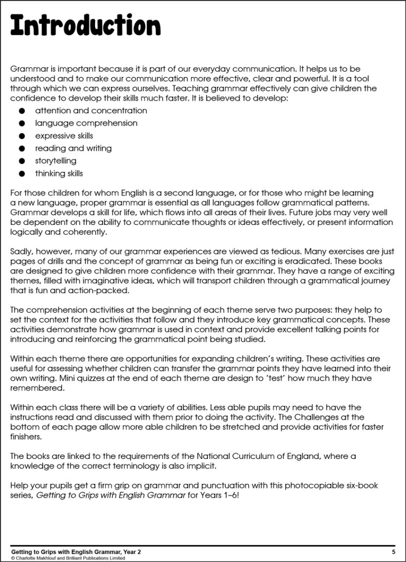 The underlying premise of the Getting to Grips with English Grammar scheme is that pupils need to see how authors use grammar and have opportunities to use it in their own writing for them to truly understand it. Throughout the series, entertaining reading passages introduce pupils to key grammar points and provide talking points for how the grammar is used. Engaging activities, all linked to the themes of the reading passages, provide reinforcement and enable children to practise using the grammar in their own writing.