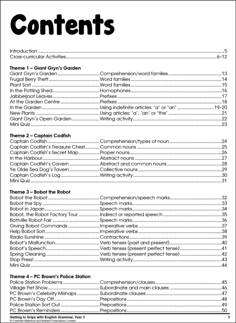 Written by Charlotte Makhlouf, the best-selling author of the Brilliant Activities for Reading Comprehension series, Getting to Grips with English Grammar, Year 3 introduces pupils to grammar and punctuation through fun, engaging themes, such as Giant Gryn’s Garden and Bobot the Robot.