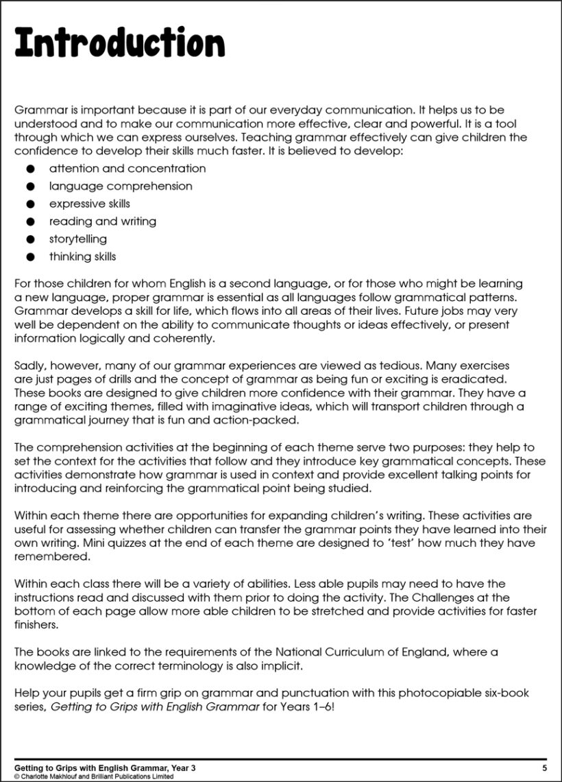 The underlying premise of the Getting to Grips with English Grammar scheme is that pupils need to see how authors use grammar and have opportunities to use it in their own writing for them to truly understand it. Throughout the series, entertaining reading passages introduce pupils to key grammar points and provide talking points for how the grammar is used. Engaging activities, all linked to the themes of the reading passages, provide reinforcement and enable children to practise using the grammar in their own writing.