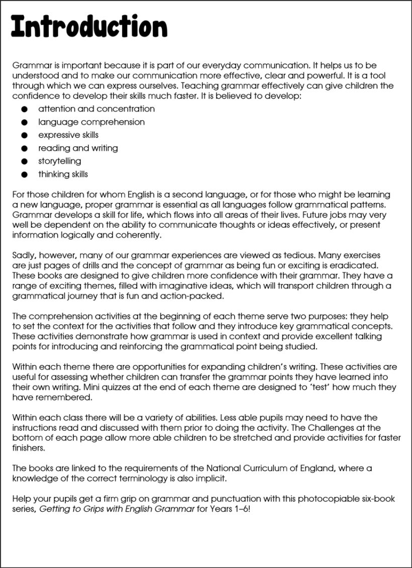 The underlying premise of the Getting to Grips with English Grammar scheme is that pupils need to see how authors use grammar and have opportunities to use it in their own writing for them to truly understand it. Throughout the series, entertaining reading passages introduce pupils to key grammar points and provide talking points for how the grammar is used. Engaging activities, all linked to the themes of the reading passages, provide reinforcement and enable children to practise using the grammar in their own writing.