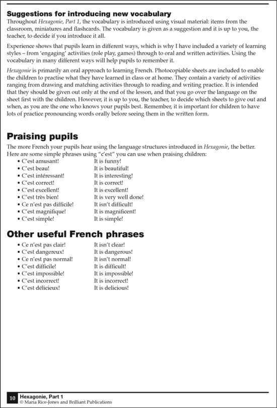- Breaks language down into manageable chunks and presents them in a methodical manner enabling pupils to feel that they can converse in French.