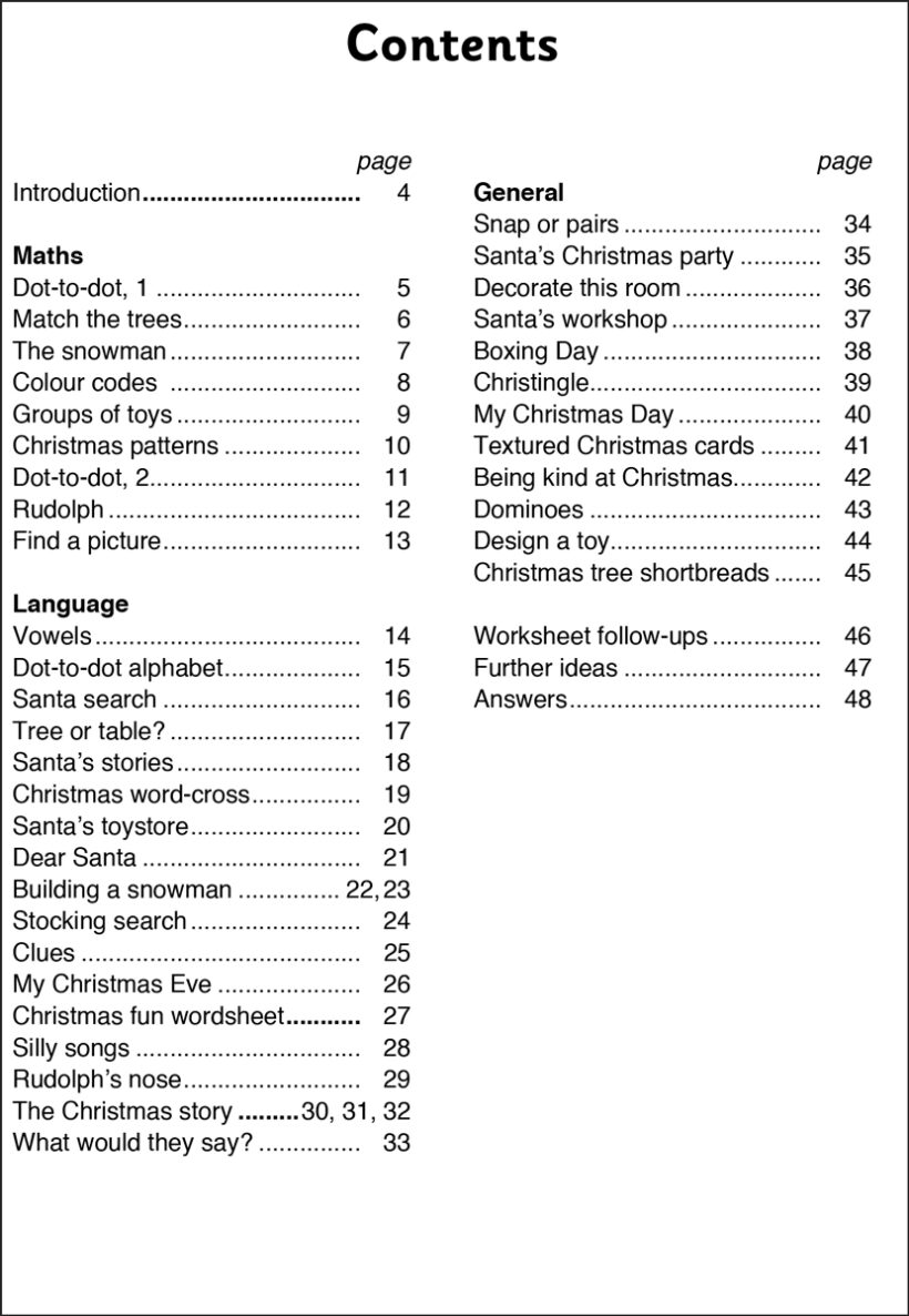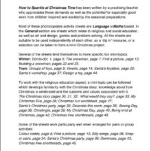 How to Sparkle at Christmas Time contains over 40 illustrated photocopiable worksheets, which can be used independently of each other, as a ‘dip-in’ resource or as a group selected to form a mini Christmas project on, for example, toys, winter or the Christmas Story. Most of the activities are language or maths based, but there is also a section containing activities which relate to religious and social education, art and design, games and problem solving.