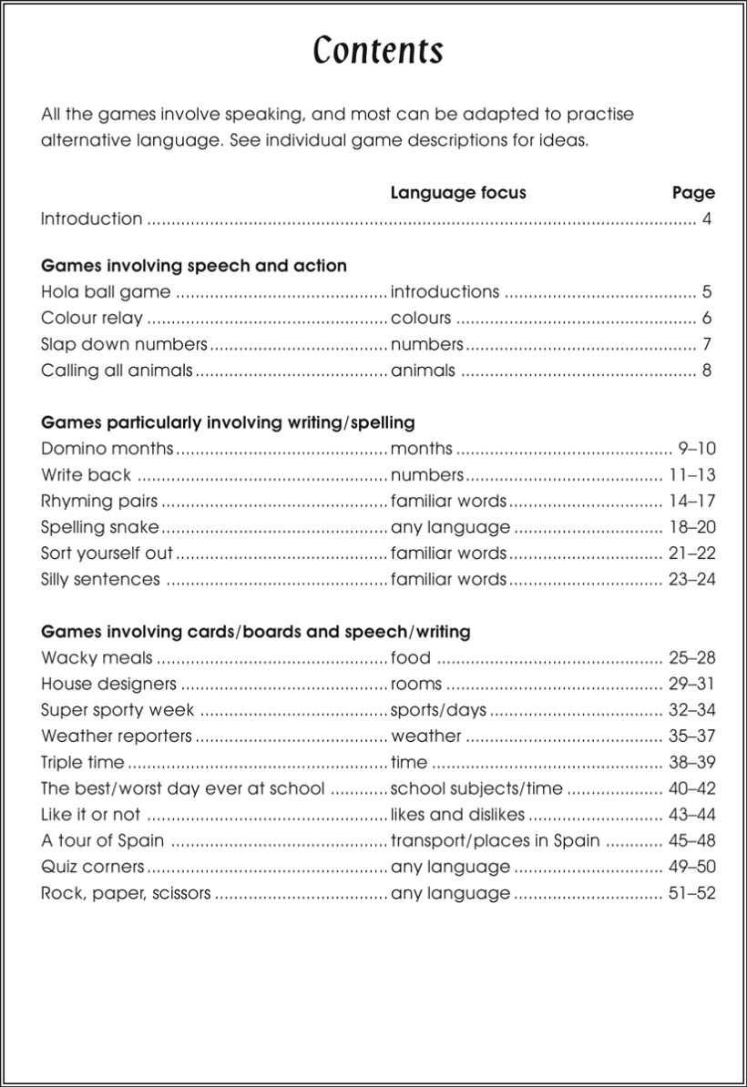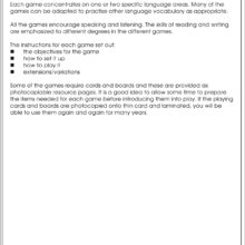 Each game concentrates on one or two specific language areas. Many of the games can be adapted to practise other language vocabulary as appropriate.