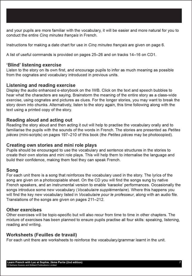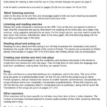 - two audio CDs of the stories acted out by native French speakers and songs, vocabulary files and listening exercises all recorded by native French speakers
