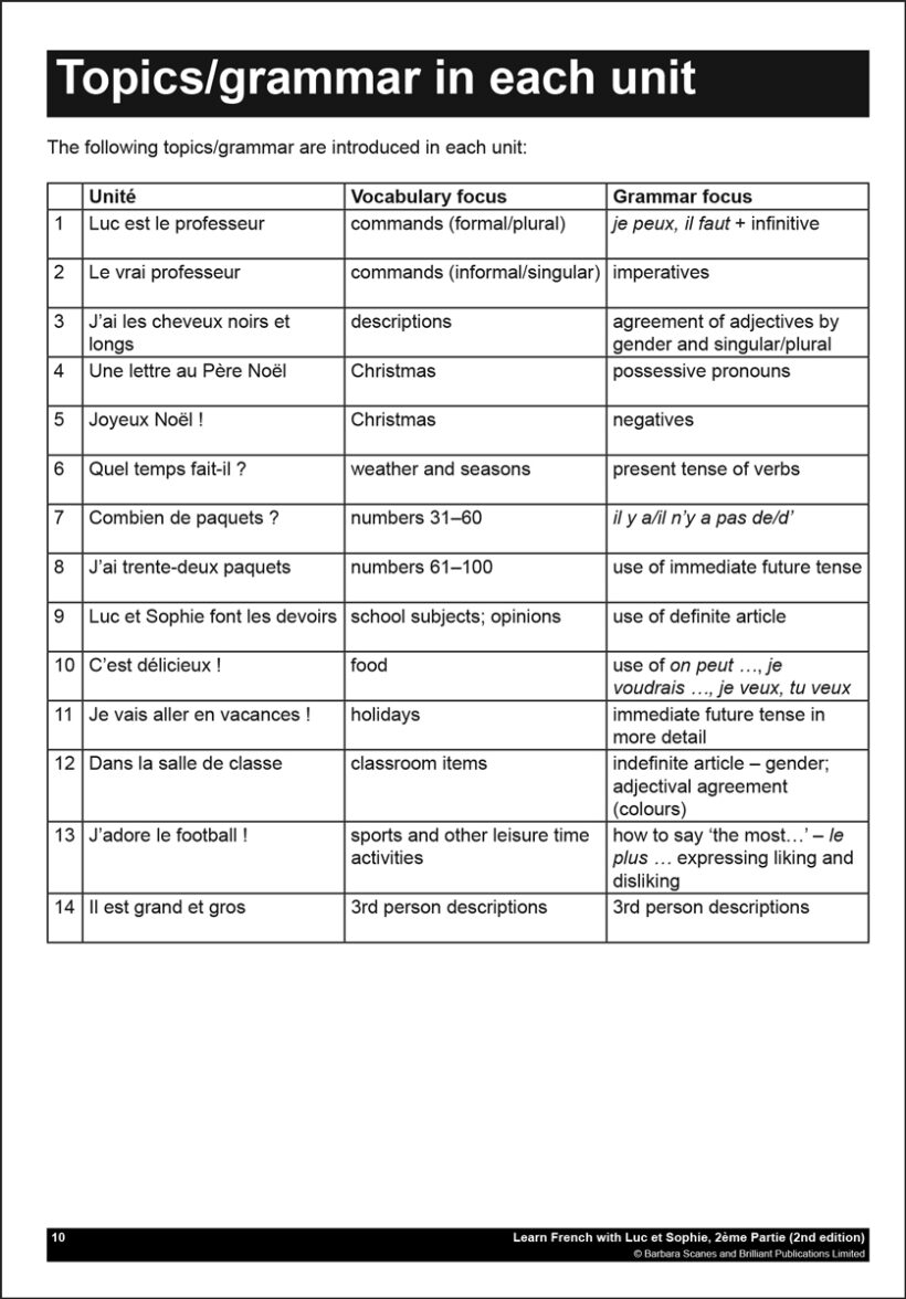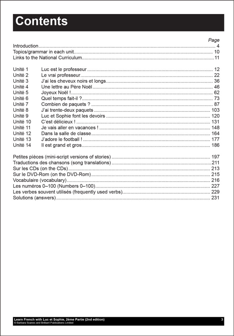There are 14 units in Learn French with Luc et Sophie, 2ème Partie. Each unit is based around a story featuring a young brother (Luc) and sister (Sophie) and their friends and family. The stories are topic-based, use simple sentences and introduce key vocabulary and language structures relating to the topic. Each unit contains an original song to reinforce vocabulary.