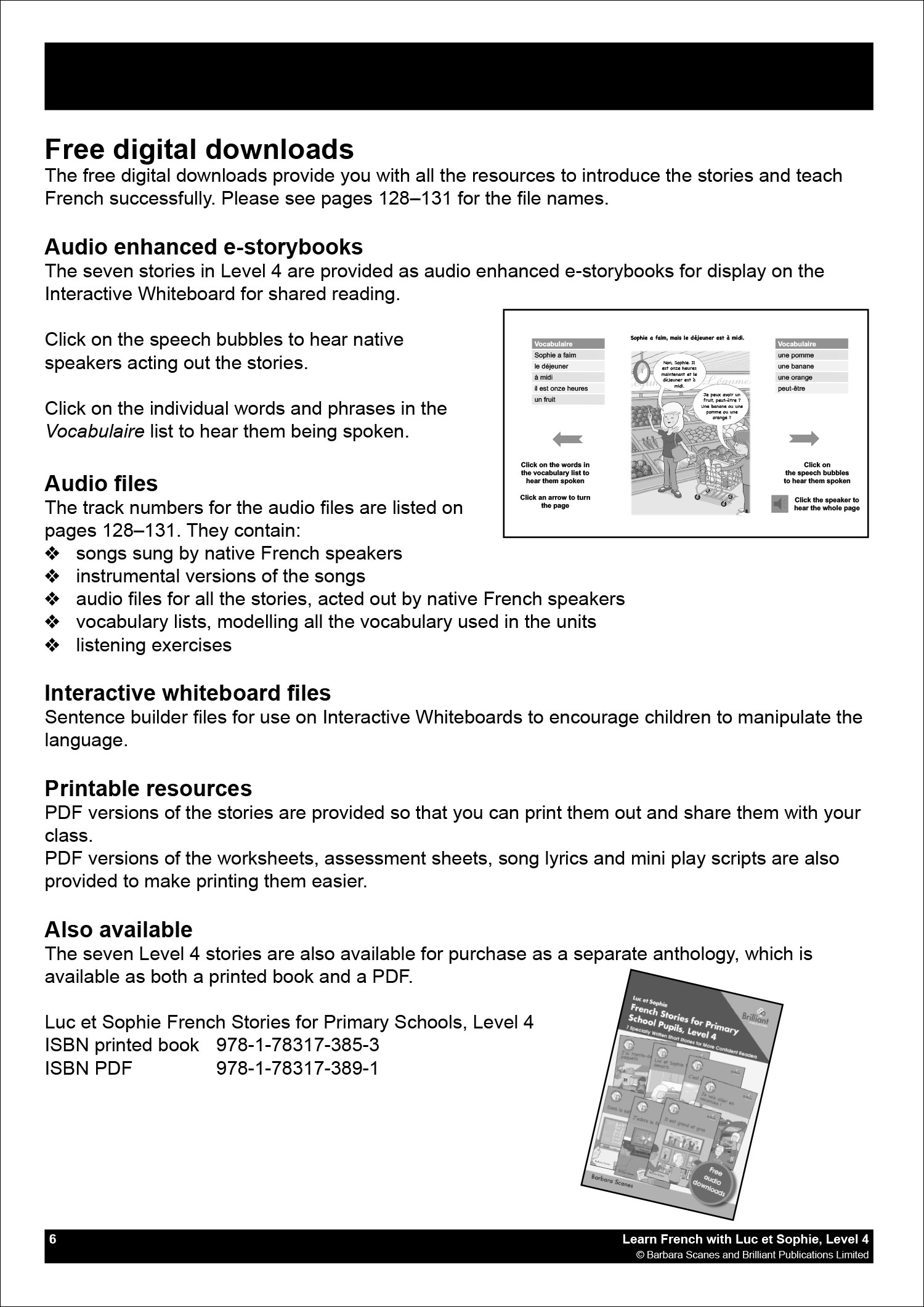 This book and accompanying resources provide everything you need to teach French in Year 6. However, to enable your pupils to better enjoy reading the stories on their own or in groups, an anthology of the stories is available for purchase: Luc et Sophie French Stories for Primary School Pupils, Level 4.