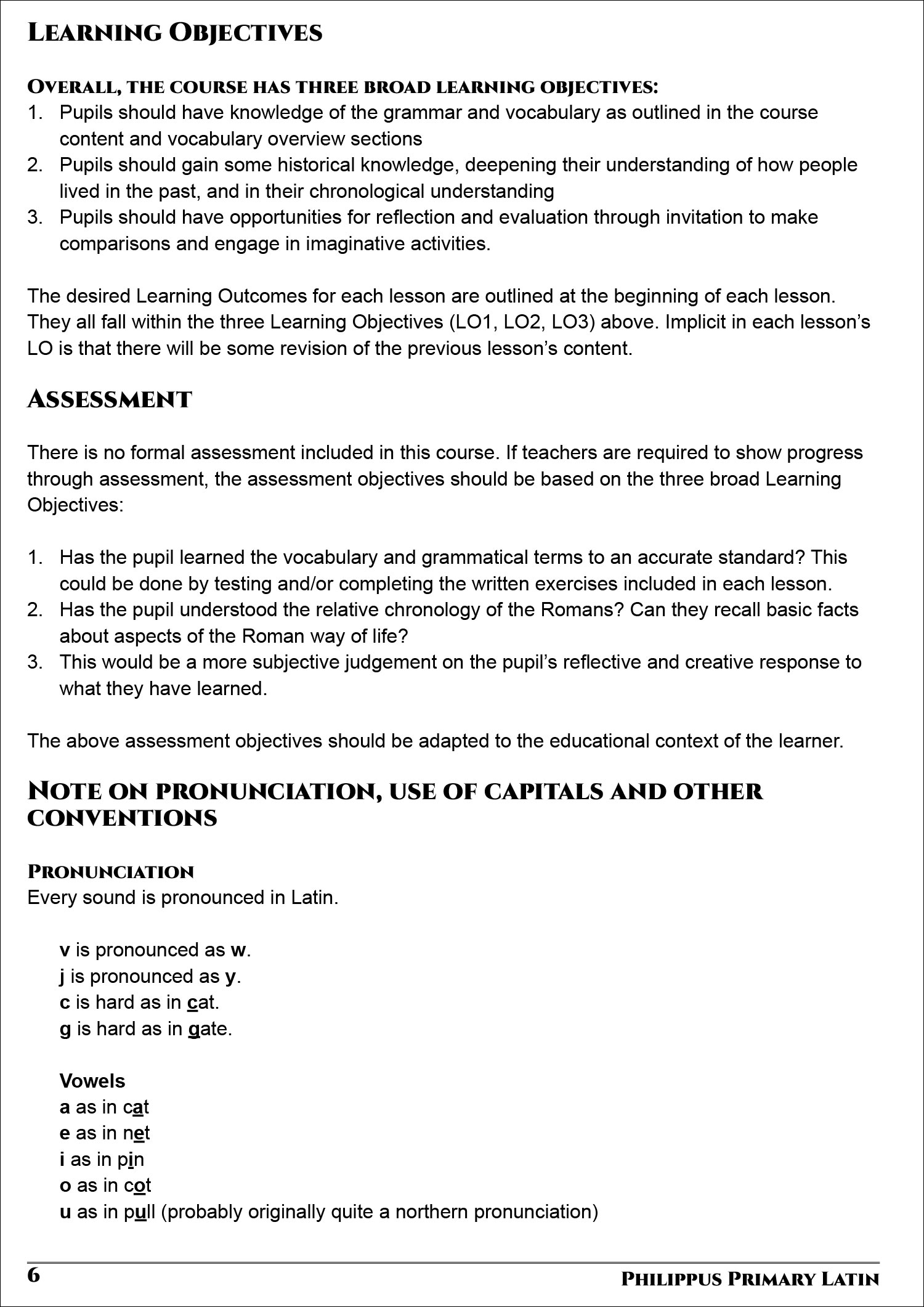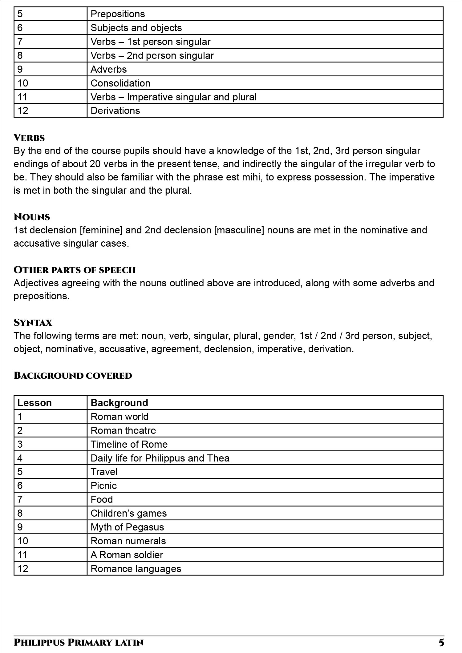 Philippus Primary Latin consists of twelve lessons with ample activities for two or three sessions, depending on time available and the requirements of the class. The free digital downloads provide all the resources needed to ensure coverage of the curriculum and adaption to suit the learning needs of all pupils. Vocabulary and grammar are systematically introduced as you progress through the course.