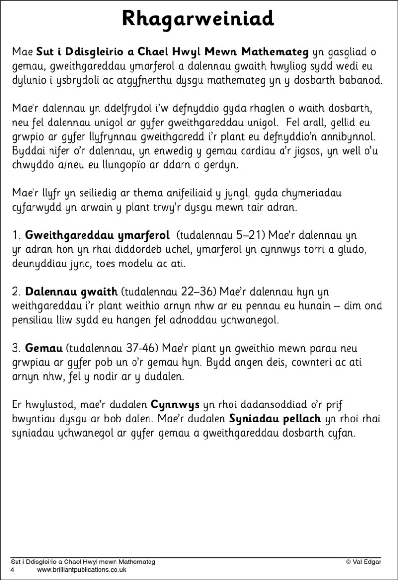 Mae Sut i Ddisgleirio a Chael Hwyl mewn Mathemateg yn gasgliad o gemau, gweithgareddau ymarferol a dalennau gwaith hwyliog y gellir eu llungopïo, sydd wedi eu cynllunio i ysbrydoli ac atgyfnerthu dysgu mathemateg yn y dosbarth babanod. Mae’r llyfr yn cynnwys gweithgareddau amrywiol gan gynnwys adio, tynnu i ffwrdd, ffeithiau lluosi a rhannu, mesur, arian ac adnabod siapiau.