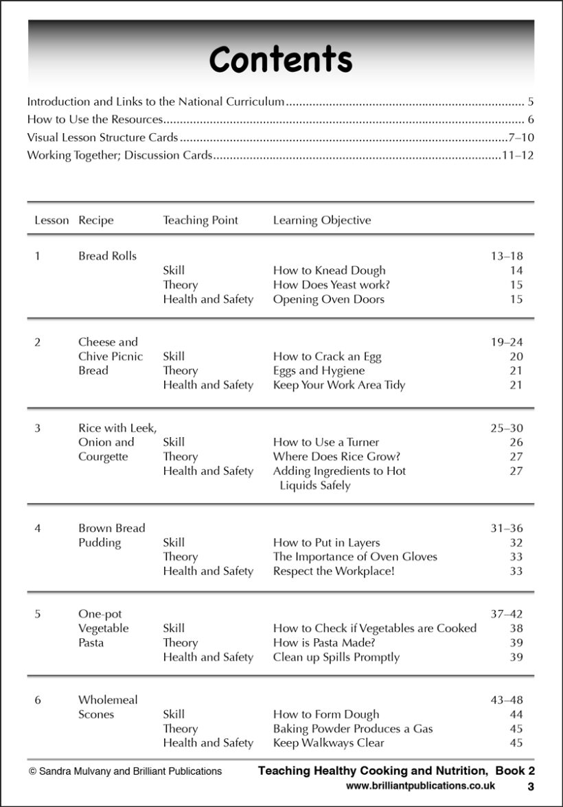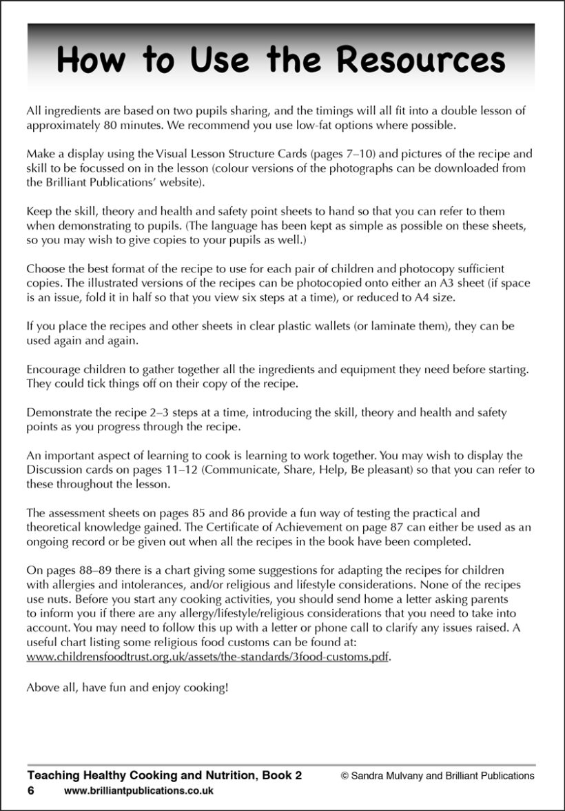 Each recipe includes photocopiable visual lesson structure cards, visual learning objectives and photographs of the food that enhance the knowledge and skills gained from making the dish. Alternative ingredients for allergy, lifestyle and religious considerations are suggested.
