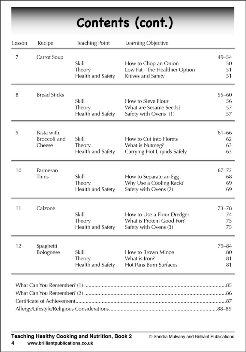 For each recipe there are essential cooking skills, theory and health and safety points, introduced progressively throughout the series. All these skills are a necessary part of cooking and, when mastered early, pupils will gain a positive experience of self-achievement and satisfaction and, yes, they will take great delight in trying the results for themselves!