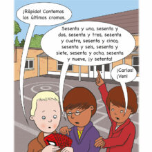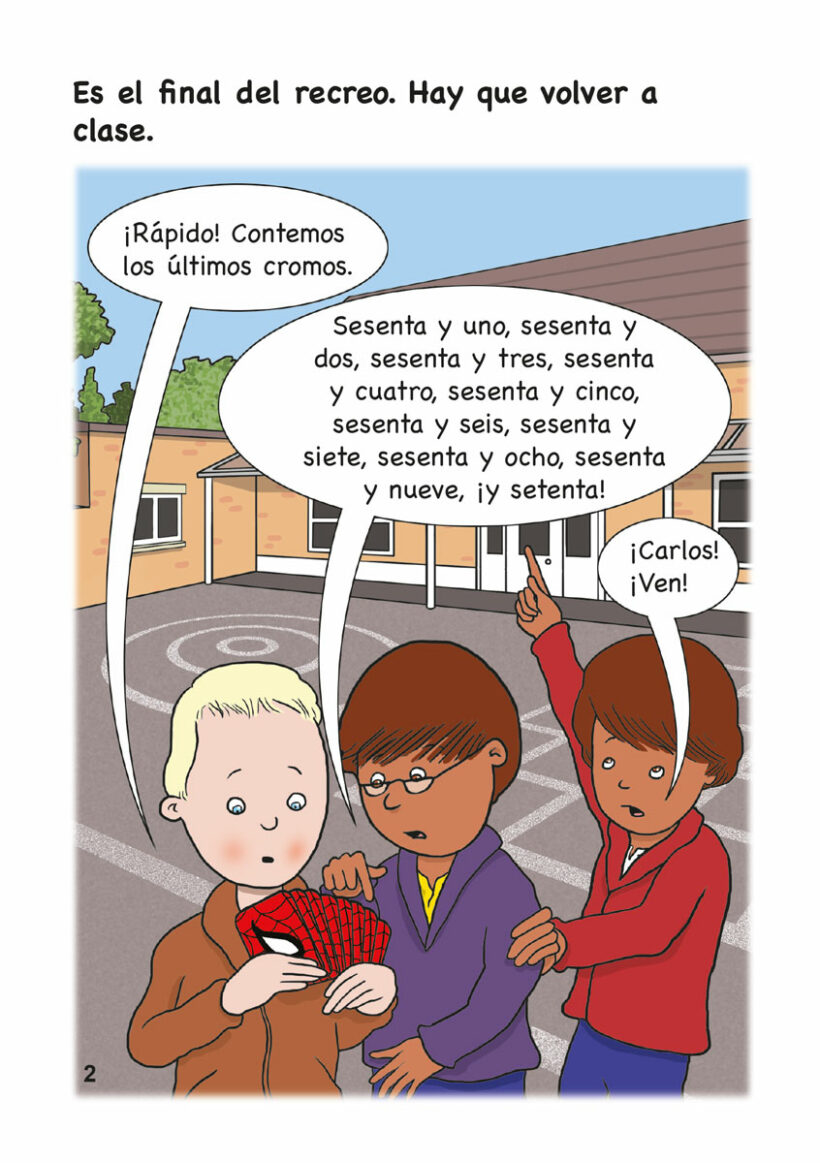 It’s the end of break time. Luis wants to finish counting his cards. Juan and Carlos don’t want to get in trouble, so they go inside. Luis has nearly finished counting up all the cards when who should come out but Señor Blanco!