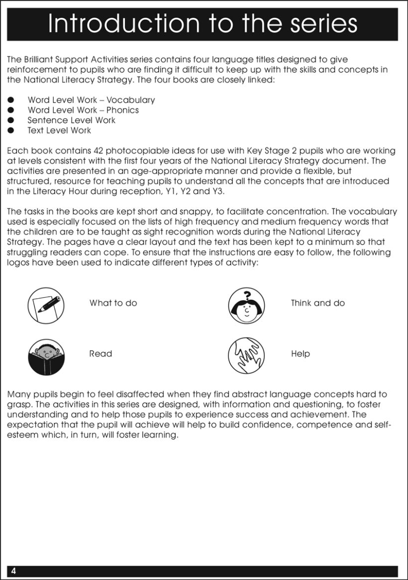 Word Level Work – Vocabulary contains 42 photocopiable activities for Key Stage 2 (KS2) pupils who are working at levels consistent with the first four years of the National Literacy Strategy document. The activities introduce one concept per sheet, and provide additional practice and support for those children who are struggling to learn concepts and skills first introduced at Key Stage 1.
